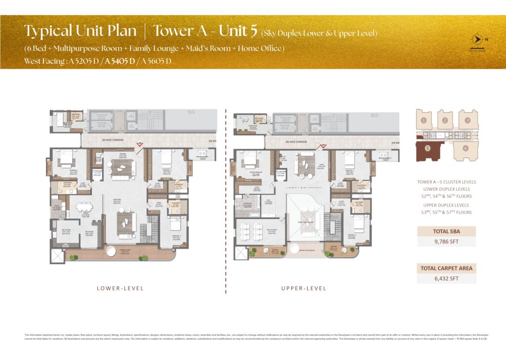 Welcome to Brigade Gateway β Tower A, Unit 5, a rare and stunning 6-bedroom Sky Duplex that redefines modern luxury living in Hyderabad. Set across the 52nd to 57th floors, this ultra-premium duplex apartment offers a breathtaking combination of elegant design, functionality, and exclusivity. With a Super Built-up Area (SBA) of 9,786 sq. ft. and a total carpet area of 6,432 sq. ft., this residence feels like a villa suspended in the clouds.